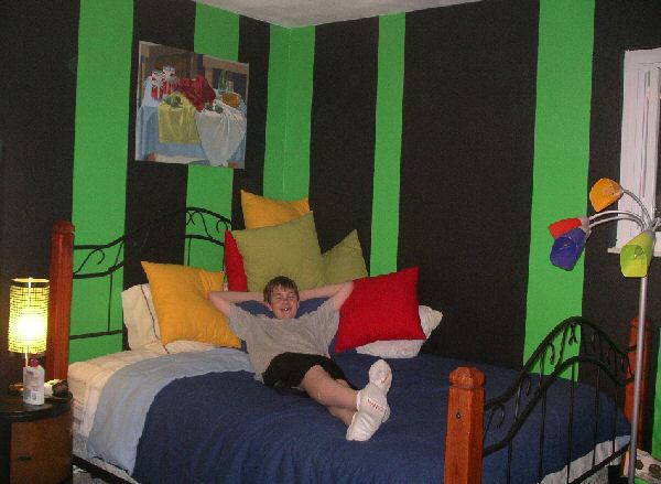 Jordan on his new bed, in his new room, surrounded by